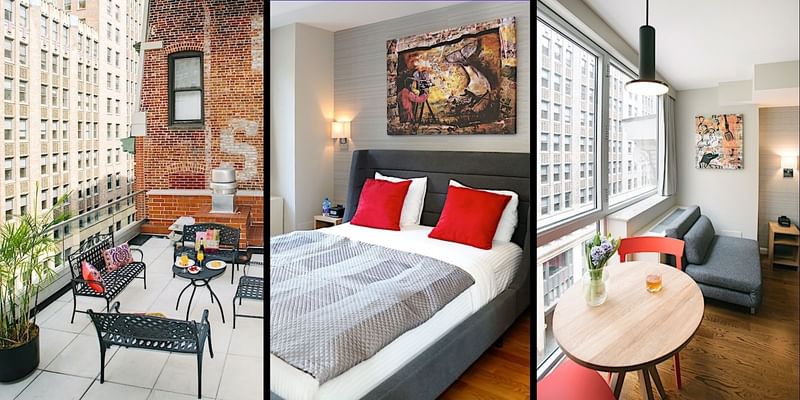 The Queen Premier with Roof deck features a queen bed and a 600 square foot completely private roof deck with breathtaking views of NYC.